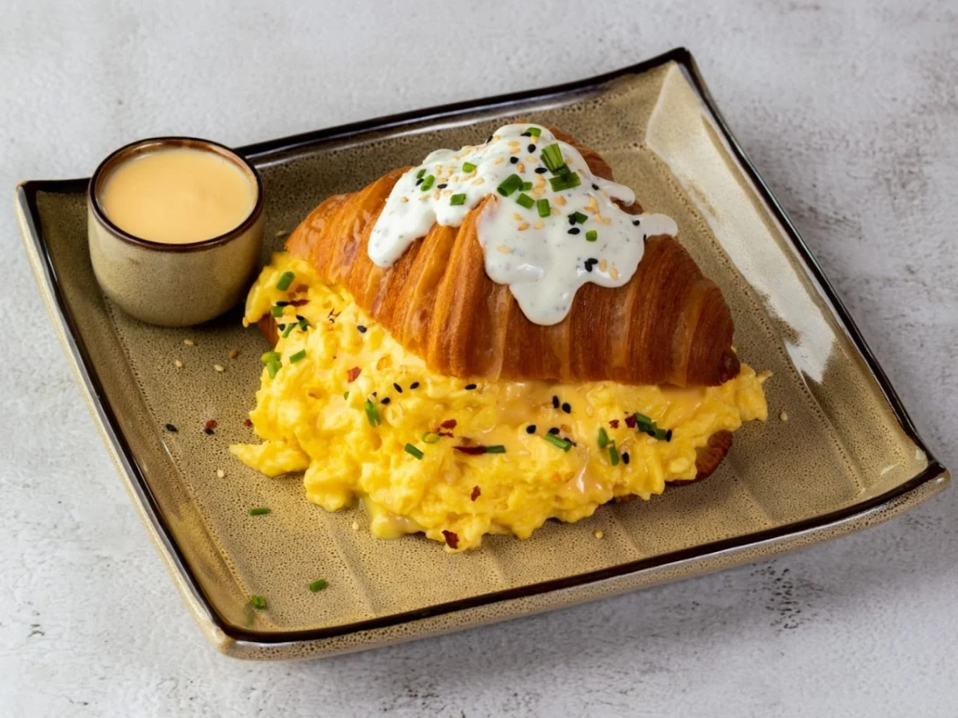 Croissant, homemade ranch scrambled egg, light cheese sauce, Calories:686 Carbs:31 Protein:37 Fat:16