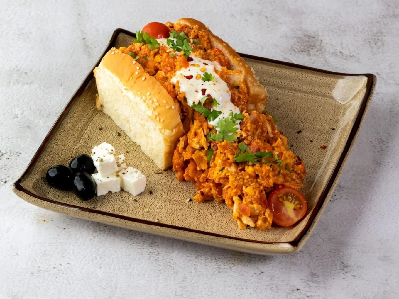Eggs, onion, tomato, dry oregano, cream cheese, sesame bread, black olives, feta cheese, parsley and chili flakes on the top. Calories:551, carbs:28, protein:31 and fat:35